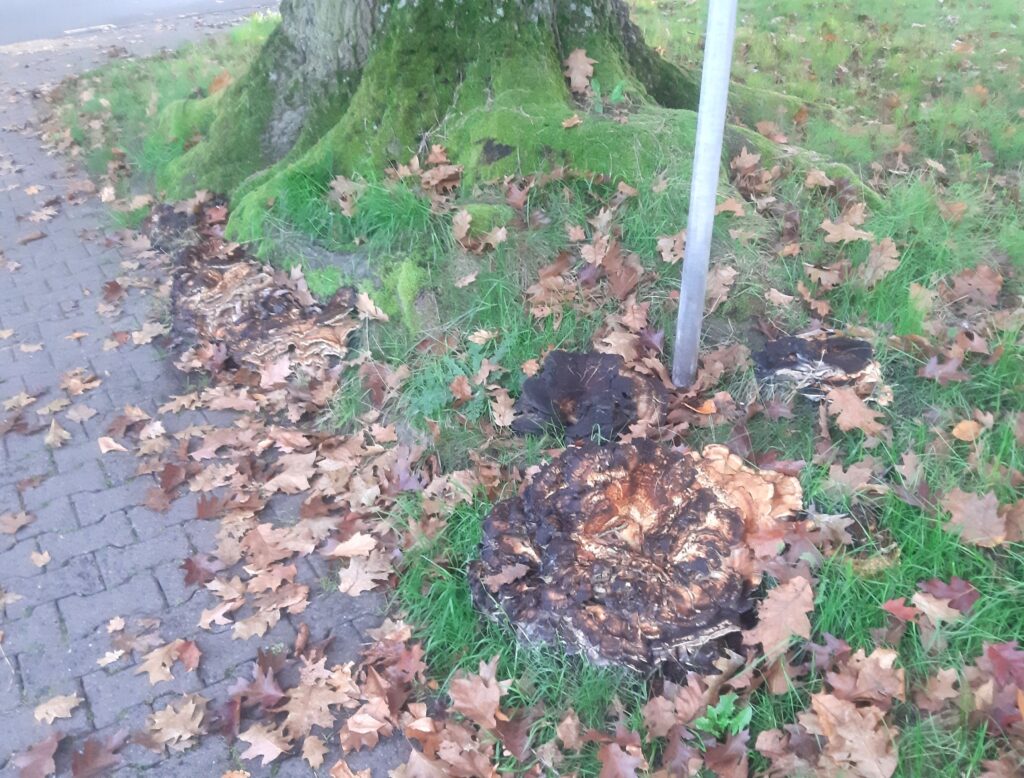 Ende 2024 zeigte sich am Stammfuß der Roteiche erstmals ein Riesenporling. Der Riesenporling ist ein wurzelbürtiger Baumpilz und zersetzt die Baumwurzeln. Er dehnt sich im Lauf der Zeit fast ausschließlich im Wurzelbereich der Bäume aus. Er befällt zunächst die tiefen Wurzeln und dringt erst im Lauf von Jahren in die für eine Inspektion leichter zugänglichen Wurzeln der unmittelbaren Bodenoberfläche vor. Die Standsicherheit der befallenen Bäume wird daher durch den Wurzelholzabbau stark beeinträchtigt, noch bevor der Pilz erstmals durch seine oberirdischen Fruchtkörper sichtbar wird. Die Vitalität der Bäume wird erst in einem späten Befallsstadium beeinträchtigt und zeigt sich zum Beispiel durch verstärkte Totholzbildung.